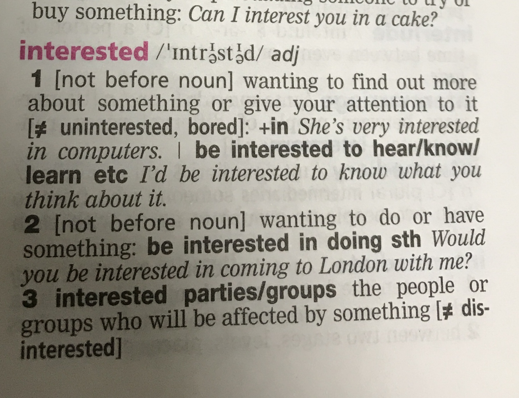 예를 들어 interested 단어를 영영사전에서 찾아보자. interested in: Joe’s always been interested in politics. 이렇게 주요 용법인 ‘interested in’이 진하게 표시되고, 그 예문이 나온다. ‘interested in’ 이렇게 세트로 기억해야 interested 단어를 문장에서 자연스럽게 쓸 수 있다. ‘interested in’ 세트로 기억해야 듣기도 잘 된다. 세트로 기억하고 있으면 우리 뇌가 interested를 들으면서 뒤에 in이 올 것을 미리 짐작한다. 뭐가 올지 알고 있으니 당연히 잘 들린다.